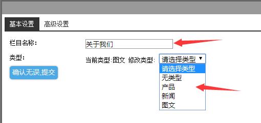 此窗口上可修改欄目名稱和顯示類型,修改后點(diǎn)擊確認(rèn)無(wú)誤,提交